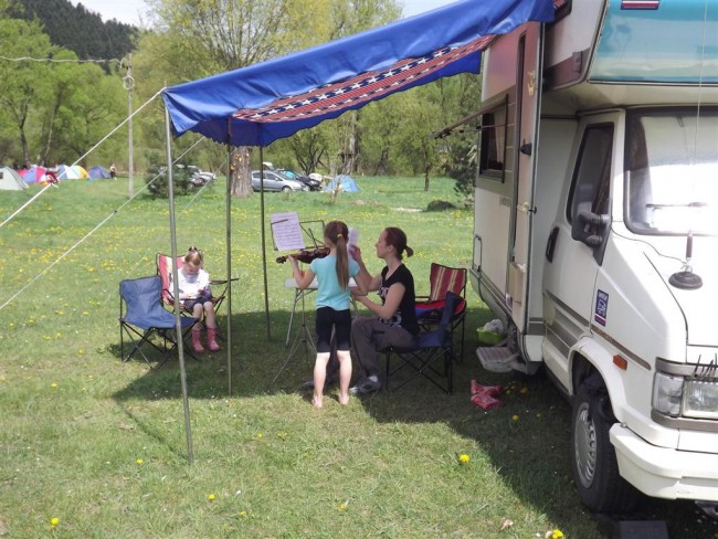 Ubudziło nas piękne słońce. Wręcz palące. Cały kemping zrzucił gumowce i peleryny . Kto miał to ustawiał leżak do słońca . Gorrrąco ... Zapowiada się piękny dzień . Plany : idziemy w góry. Ale najpierw obowiązek czyli koncerst skrzypcowy w wykonaniu Zosi. Uratował nam tyłek ... Coś tam nie wychodziło , czas leciał i leciał a nad górami pojawiła się ciemna chmura . Potem druga i już było wiadomo że z gór nici. Nagle , uderzenie wiatru. Dzieci skrzypce, krzesła do Kurdupla. Drugiego "powiewu" nasz daszek nie wytrzymał. Szybka akcja ratowania przebiegła sprawnie chociaż zaczęły lecieć pierwsze krople deszczu. Wpadliśmy do auto i zaczęło się :deszcz: . Ulewa, ogronmy wiatr , burza i grad . Widac było tylko że co jakiś czas coś przelatuje koło nas. Dzieci ryczały przestraszone, grad walił z 5 minut , cudowna majówka.