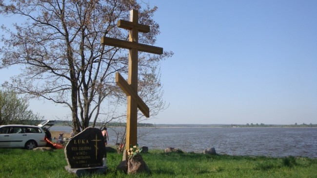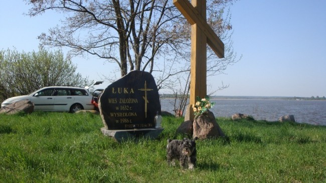 Zszokował nas kamień upamiętniający miejsce, gdzie kiedyś była wieś Łuka, wysiedlona w 1986 r. czyli chyba wtedy, gdy tworzono to jezioro jako zbiornik retencyjny. Nie tyle sam kamień pamiątkowy nas zszokował, co wyryty m.in. na nim krzyż jak również stojący obok krzyż a obok znicz i kwiaty jakby dotyczyło to zmarłych. A wieś Nowa Łuka, czyli tam gdzie przeniesiono tą wieś, jest dosłownie obok.