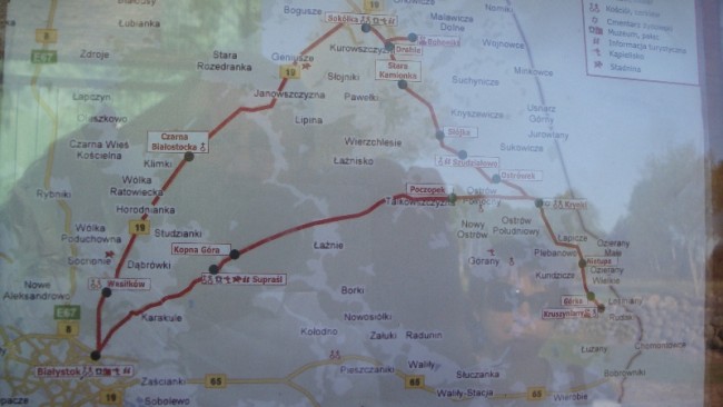 Znad Jeziora Siemianowskiego pojechaliśmy przez Nową Wolę i Gródek, gdzie widzieliśmy kolejne cerkwie, a później DK nr 65 w stronę przejścia granicznego w Bobrownikach. Chcieliśmy dotrzeć do Kruszynian drogą wzdłuż samej granicy, choć wcześniej minęliśmy drogowskaz w lewo wskazujący Kruszyniany. Jednak kolejka TIRów do granicy była dużo dłuższa i do drogi na Kruszyniany musiałbym jechać lewą stroną drogi. A co by było, gdybym trafił na samochód jadący z granicy. Nie było by gdzie się minąć. Wobec tego zawróciłem do wcześniejszego odjazdu do Kruszynian. Połowa tej 10 km drogi to szuter bardzo mocno zakurzony. Za granicą powiatu druga połowa tej drogi, nowiutki asfalt.