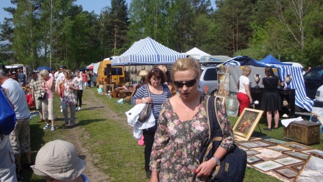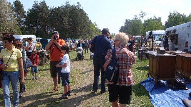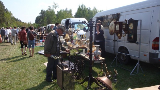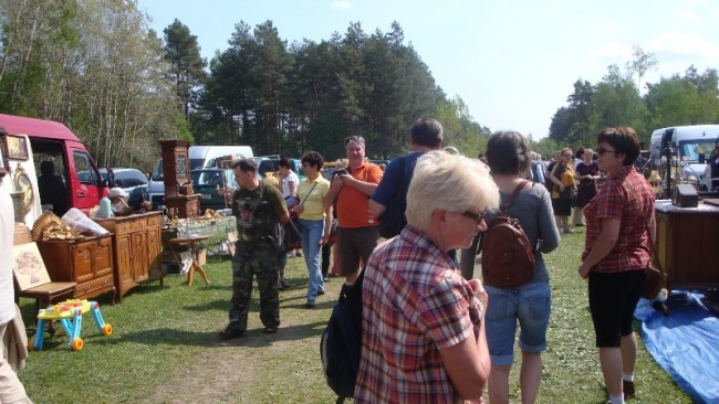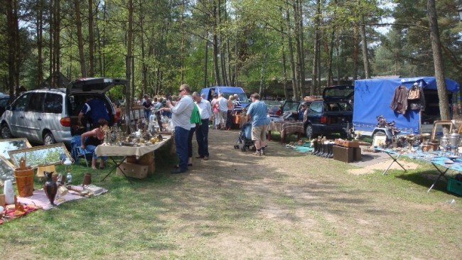 Tematem jest droga do Wasilkowa, ale z Wasilkowa tez nie od razu jechaliśmy do domu. Ponieważ była to pierwsza niedziela miesiąca, niedaleko odbywał się duży targ staroci i wyrobów regionalnych w Kiermusach. Pojechaliśmy w 3 kampery. Wjeżdżając do Kiermus przejeżdżaliśmy wzdłuż zaparkowanego na poboczu wąskiej drogi szpaleru samochodów. Jak zobaczyliśmy masę samochodów poupychanych po bocznych dróżkach, zwątpiłem, gdzie my zawrócimy aby stanąć na wjeździe do wsi.