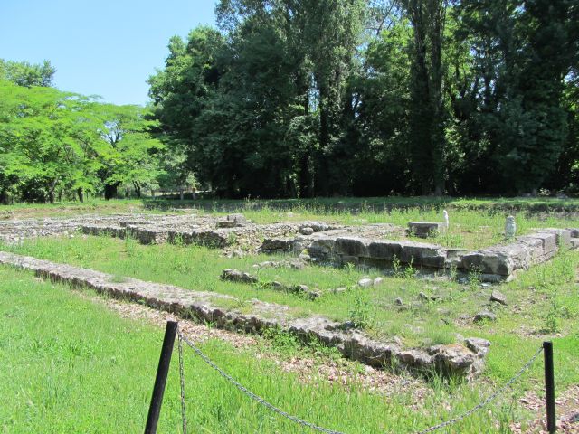 Do ruin docieramy bez problemu dzięki drogowskazom – po wjeździe do miasta kierować się w prawo. Parking prawie pusty, a że dzisiaj niedziela to wchodzimy do parku za darmochę (normalnie wejście to 3 lub 4 Euro za osobnika. Można wejść z czworonogiem ). Całość ruin znajduje się (jak wspomniałem) w parku, co szczególnie doceniamy, ponieważ słońce pali niemiłosiernie, a dzięki drzewom jest tutaj trochę cienia! Doskonale zachowane są zwłaszcza ruiny miasta i mozaiki w termach – piękne. Warto odwiedzić to miejsce!