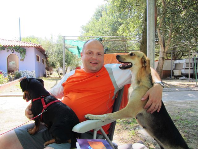 Połowę pierwszego dnia planujemy poświęcić na byczenie się na plaży (tyle wytrzymamy ). Później spacer do Ouranoupoli. Drugi dzień: wycieczka statkiem w okolice góry Athos i dzień trzeci: wyprawa do Stagiry. Uchwała podjęta – głosów sprzeciwu nie odnotowano. W czasie obrad zauważyłem „kątem oka”, że ktoś z pewnej odległości, ale dosyć intensywnie nam się przygląda... Dosyć intensywnie, to za mało powiedziane – siedzi i nie spuszcza z nas oka! Odwracam głowę – obserwator na czterech łapach siedzi jakieś 20 metrów od nas i gapi się jak w obrazek. Wyciągam rękę w kierunku psiaka i w ciągu pół sekundy mam na sobie przednie łapy dość pokaźnych rozmiarów suczki, którą Magda nazwała Ziutą, a która stała się na te trzy dni częścią naszej ekipy (element grecki ) Ziuta okazuje się niesamowicie przyjaznym pieskiem. Jest bardzo towarzyska i łagodna, zarówno dla nas jak i dla Figi – obie suczki zakumplowały się od pierwszego obwąchania i od tej pory leżały razem obok siebie, czasem wspólnie szalały biegając koło kamperka. Wieczorem zagadnąłem Gregorego o tego psiaka i okazało się, że na kemping przychodzą czasami różne bezdomne pieski i koty. Rodzina właścicieli kempingu nie dokarmia tych zwierząt i nie zajmuje się nimi, ale też nie wygania ich. Zwierzaki są łagodne, nie są natarczywe wobec przyjezdnych więc nie ma problemu. A często zdarza się, że goście kempingu zaprzyjaźniają się ze zwierzakami i przynajmniej kilka dni są razem. Tylko te rozstania muszą być później bolesne.... W każdym razie Figa sama zgłasza na posiedzeniu Rady Starszych, że podzieli się swoimi zapasami żarełka z Ziutą – Rada przyjmuje wniosek uznając, że to bardzo szlachetne ze strony Figi Zresztą sama Figa też wie co nieco o byciu bezdomnym pieskiem, bo ją kiedyś też ktoś wyrzucił z domu, ale dzięki schronisku w Primeticach Figa znalazła nas i już tak zostało ku obopólnej radości