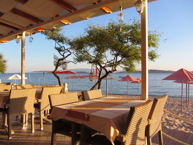 Po powrocie do Ouranoupoli decydujemy się na chwilę odpoczynku w jednej z knajpek nad brzegiem morza. Jemy skromny obiadek (gyros – pycha!) i wracamy na kemping. Trochę zmęczeni wyprawą ograniczamy naszą aktywność w ciągu reszty dzisiejszego popołudnia do korzystania z uroków kempingowej plaży, a szczególnie wspaniale orzeźwiającej wody morskiej....