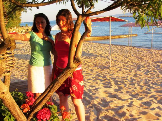 Dojeżdżamy do Ouranoupoli, okolica piękna więc trochę jestem zagapiony i rozkojarzony.... Nagle, po prawej stronie ulicy duży napis CAMPING OURANOUPOLI, a w głębi, nieco poniżej ulicy wjazd na kemping. Hamuję, cofam, włączam awaryjne i wysyłam dziewczyny na zwiad – jeśli im się spodoba, to zostajemy. Jeśli nie, to pedałujemy dalej, czyli do miasteczka. Jako, że okolica super, to mam nadzieję, że im się spodoba. Długo nie wracają, co biorę za dobrą monetę. Za chwilę widzę je jak spacerują po kempingu, a jakieś młode, miejscowe dziewcze zaznajamia je z terenem bardzo żywo przy tym gestykulując Za chwile Magda i Lenka wracają – już z daleka widzę, że uchachane i zadowolone, więc odpalam kampera niemal nie czekając na ich potwierdzenie, że jest OK. Potwierdzają, dodając, że jest zdecydowanie lepiej niż OK. Jest brutalnie OK!!! (wyjaśnienie dla czytelnika: w terminologii Lenki, jeśli coś jest brutalnie dobre, to znaczy, że jest absolutnie wyjątkowe, niezrównane, itd. ). Wjeżdżam na teren kempingu, wybieramy miejsce pod zadaszeniem z siatki i naturalnym cieniem z drzew – to ze względu na Figę. Obok są też miejsca niemal nad samym morzem, ale jeszcze nie „zamontowali” tam cienia, czyli zielonej siatki na konstrukcji metalowej, więc odpada. Ale miejsce i tak bomba. Idę na plaże – trzy kroki od kampera, po drodze mijam sklepik (1 krok od kampera ) i restaurację (2 kroki od kampera ). Restauracja ma też swoją część zupełnie na plaży, na drewnianym tarasie. Wszystko to prowadzone jest przez rodzinę: mama Maria, tata i ich już dorosłe dzieci: Anna i Gregory. Plaża prywatna – bardzo kameralna, piasek i łagodne zejście do kryształowo czystego morza. Widok na wyspę oraz środkowy półwysep Chalkidiki – Sithonia. Jednym słowem: TO JEST TO!!!! O to chodziło! Tak! 3x tak!!! Cisza, spokój. Wkrótce przekonamy się, że to jeszcze nie wszystko – to miejsce jeszcze nas zaskoczy