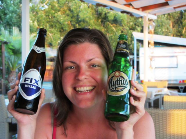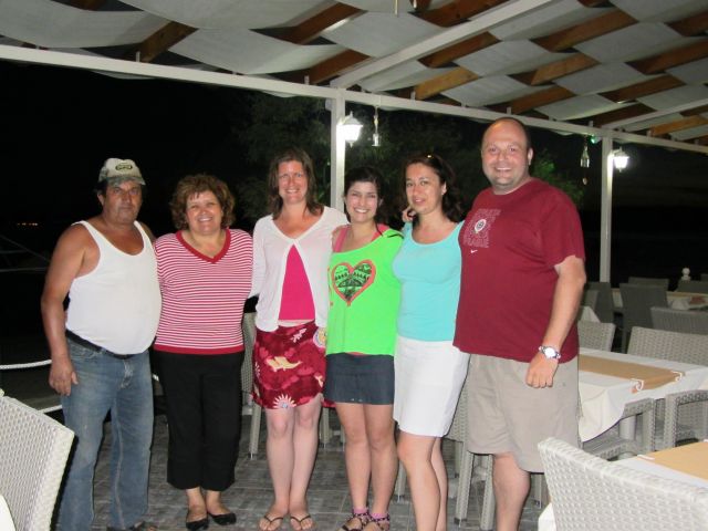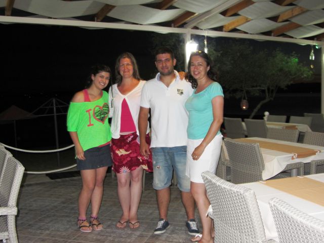Po kąpieli i prysznicu idziemy do restauracji na kolację. Obsługuje nas Anna. Maria gotuje, a Gregory jej pomaga – super! Tak właśnie wyobrażam sobie biznes rodzinny. Siadamy sobie na tarasie przy samej plaży, za nami delikatnie gra muzyczka (żadne bum, bum.... ), a Anna jeszcze dodatkowo ją ścisza, żeby nam nie przeszkadzała w słuchaniu morskich fal... No i nie można tutaj było trafić od razu???? Zamawiamy żarełko – ja biorę grillowaną fetę, frytki, jakąś sałatkę. Czekamy trochę dłużej niż może to zaakceptować mój głód , ale to tylko dlatego, że wszystko jest przygotowywane na świeżo – żadne odsmażanie, odgrzewanie i inne cuda. Zupełnie od początku i tak ma być! Do tego piwko (Lenka przekonała się do miejscowego FIX, ja zostaje przy Mythos), Magda winko... Na koniec zamawiamy po porządnej lufce Ouzo i dodatkowo dostajemy deser na koszt firmy! W między czasie porozmawialiśmy jeszcze z Gregorym o miejscu i życiu tutaj i tak ogólnie – bardzo miły gość, prawda Leni?