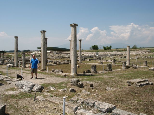 Po około 1,5 godzinie (planowaliśmy na to miejsce max 0,5 godziny) ruszamy dalej w kierunku Pelli. Pella był dawniej stolicą Macedonii. Liczba mieszkańców w tamtych czasach wynosiła około 15 000 ludzi co dzisiaj, widząc ruiny Pelli, trudno sobie nawet wyobrazić. Autostrada pusta, później skręcamy w boczną drogę. Słońce praży. Kiedy docieramy do Pelli, jest okrutny upał. Dlatego ja z Figą ograniczmy zwiedzanie do minimum. Ruiny Pelli są dostępne do oglądania za darmo. Jednak robią duże wrażenie (przynajmniej na mnie). Są bardzo łatwo dostępne - wszystko na otwartym terenie, pilnowane jedynie przez jednego gościa z pieskiem, który natrętnie zaczepiał Figę, czym zaczął wkurzać nawet mnie! Swoją drogą to ciekawe – ta dostępność tak unikalnych zabytków jest w Grecji faktycznie aż nienaturalna. Coś takiego w Niemczech, Francji czy gdziekolwiek indziej – szczelnie ogrodzone, kolejki, autobusy, bilety po 20 Euro, stragany z popcornem i colą..... A tutaj nic – po prostu jest i można wejść i poczuć siłę i wiek tych murów, kształtów....