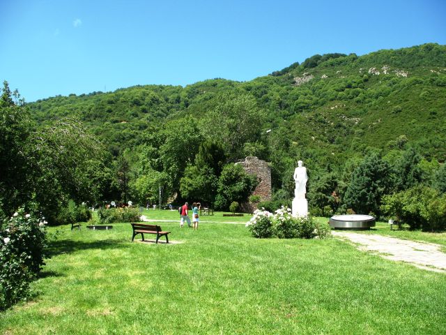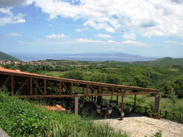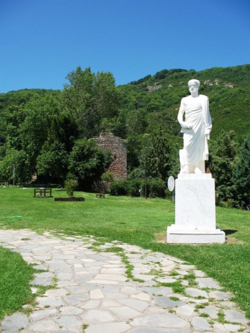 Nasz ostatni pełny dzień na kempingu Ouranoupouli, to – zgodnie z planem – wyprawa do Stagiry, czyli miejsca narodzin Arystotelesa. Najpierw musieliśmy ustalić, która to Stagira : ta nad morzem czy ta w głębi lądu. Po konsultacji z Gregorym okazuje się, że to miasteczko w głębi lądu i przejeżdża przez nie autobus z Ouranoupoli do Thesalonik. Faktycznie jest dokładnie tak jak mówi Gregory (nie, żebym mu nie wierzył ) – autobus nawet bez naszego specjalnego nalegania zatrzymał się dzięki uprzejmości pana kierowcy niemal pod samym wejściem do parku Arystotelesa. Sam park (wejście za 1 Euro) jest taki sobie – z jednej strony, można sobie przypomnieć co (oprócz filozofii) pana Stagirytę interesowało, ale z drugiej strony, to po 30 - 40 minutach jesteśmy gotowi, żeby wracać.... Na szczęście nieco poniżej jest mała restauracja, więc w oczekiwaniu na autobus powrotny (autobus w kierunku Ouranoupoli jedzie za około 2 godziny od momentu kiedy wysiedliśmy w Stagirze) konsumujemy obiadek Sama Stagira jest małym miasteczkiem i nie ma tam nic ciekawego do zobaczenia.