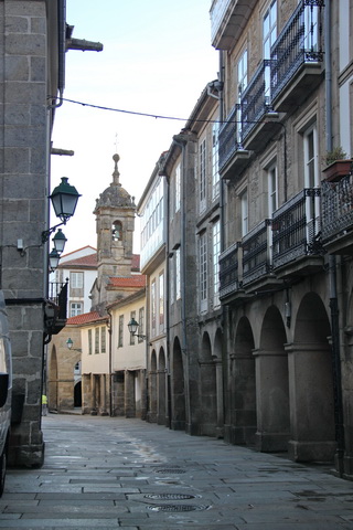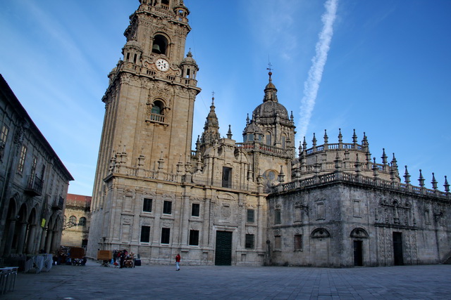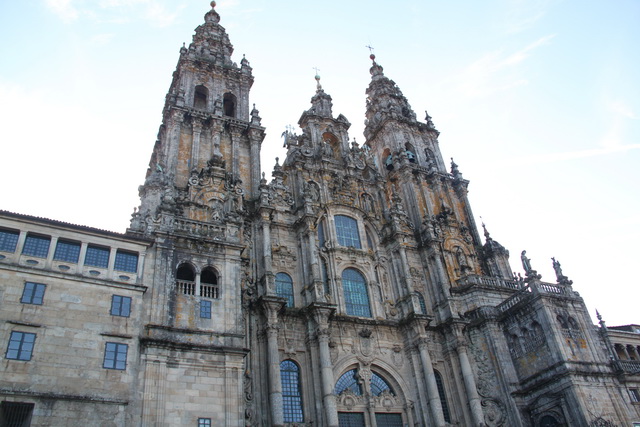 Na placu przed katedrą miejscem spoczynku Św. Jakuba Większego jednego z dwunastu apostołów, spotykamy pielgrzymów mających po kilkaset kilometrów w nogach. W uliczce obok kolejka pielgrzymów z plecakami czeka na wydanie compostelki - zaświadczenia o odbytej pielgrzymce na podstawie Credencial del peregrino - paszportu pielgrzyma, w którym na całej trasie zbiera się stemple. Jadąc od Francji spotykaliśmy ich czasem na trasie ich znak szczególny to muszla przegrzebka przypięta do plecaka i kostur. Przed podróżą czytaliśmy książkę Niemieckiego komika Hape Kerkelinga "Na szlaku do Komposteli" i teraz mogliśmy niektóre fragmenty drogi zobaczyć i tym bardziej docenić ten wyczyn.