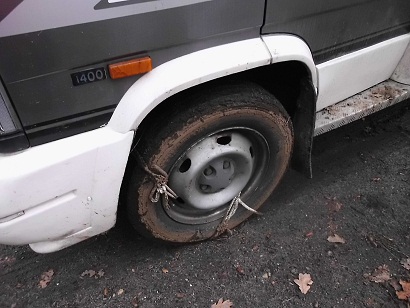 w ostatni weekend, będąc w Osolinie, gdy na opadłe liście spadł śnieg w nocy z soboty na niedzielę, nie miałem pewności czy wyjadę o własnych siłach, zastosowałem swój pomysł, czyli paski zębate. założyłem po jednym na koło, z lenistwa. wystarczyło.