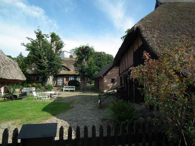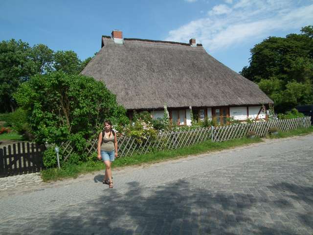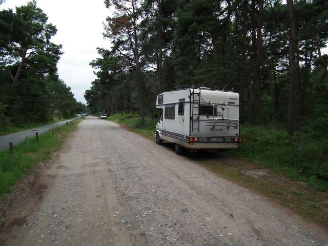 Dzień, w trakcie którego prawie więcej przeszliśmy niż przemieściliśmy się kamperkiem. Pierwszy widok z okna w postaci śpiących na krawężniku przy VW Transporterze trzech kobiet i psa nas zaskoczył. Pewnie w środku im za gorąco było. Rankiem wypuściłem się na poszukiwanie możliwości rozmienienia monet. Panie z VW nie potrafiły nam pomóc (same ledwo na swój postój miały), więc wyruszyłem na spacer do pobliskiej stadniny, a następnie nie zastawszy tam nikogo w Siedlung. Jedyna sklepo-restauracja zamknięta była na głucho, a ja w akcie desperacji zaczepiłem jedyną żywą duszę w postaci pakującego manele do Passata starszego pana. Po chwili niepewności i jego konsultacjach z małżonką zapanowało porozumienie i doszło do transakcji wymiany, po czym z drobnymi o równowartości 5E wróciłem do wozu. Wraz z rosnącym upałem wyruszyliśmy ścieżką wijącą się skrajem lasu w stronę przylądku Arkona. W Arkonie zakupiliśmy znaczek i pamiątki, weszliśmy do muzeum w bunkrze, obejrzeliśmy piasowe foki, zobaczyliśmy orła stojącego na najdalej wysuniętym na północ miejscu Niemiec bez schodzenia na wybrzeże (z powodu zakazów) i po kilku godzinach i względnych atrakcjach w postaci widoku otyłych, opalających się soute na plaży starszych Niemek, wróciliśmy do samochodu. Przez Altenkirchen (zakupy) dojechaliśmy do mierzei Schaabe. Każdy z mijanych parkingów (pomimo obecności kamperków) był naznaczony uwagą o „parkowaniu dziennym”. Nie chcąc ryzykować jechaliśmy dalej. Na samym końcu mierzei znajduje się miejscowość Glowe. W pierwszym podejściu