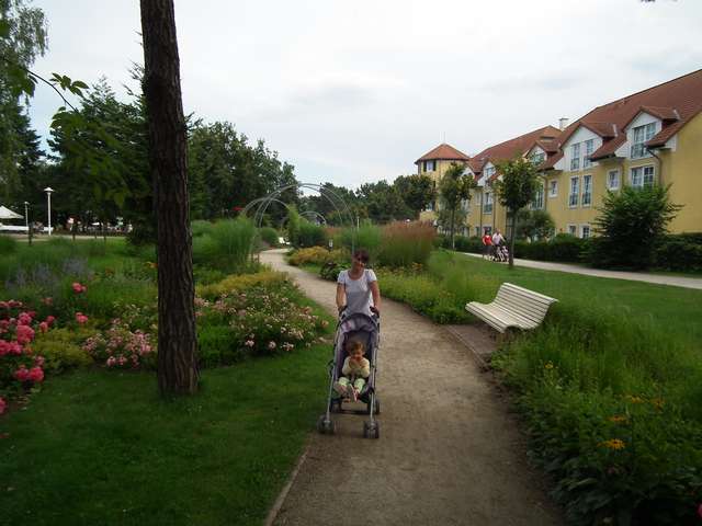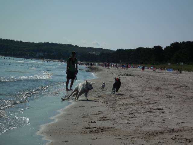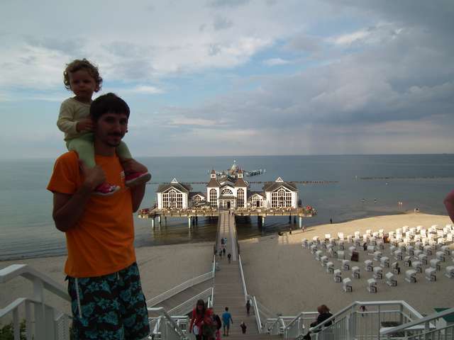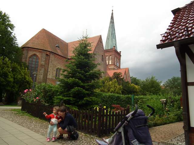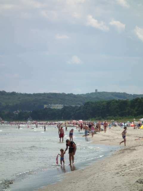 Pogoda, która rano pojawiła się za oknem skłoniła nas do rozpoczęcia dnia od chwili plażowania. Zimny wiatr co prawda ostudził kąpielowe zapędy (choć Ala w pieluszce się ciapkała) ale dopołudnie upłynęło całkiem sympatycznie na prawie pustej plaży Grosser Strand. Po powrocie do samochodu wyruszyliśmy ruchliwym chodnikiem - ścieżką rowerową w kierunku końca Rugii - Sudperd w Thiessow. Na wieżę widokową na przylądku nie udało się wyjść z powodu braku odpowiednich do automatu monet, ale miejscowość wraz z przylądkiem i śmierdzącą Weststrand w miarę dokładnie zwiedziliśmy. Jeszcze tylko powrotny spacer i można ruszać w dalszą drogę w stronę pozostałych kurortów. Pierwsze z kolejce było Gohren ze stacją końcową Rolanda, małym molo i biegającymi sarnami. Stąd wyruszyliśmy do Baabe na zauważony w dniu poprzednim parking przy dworcu kolejowym. Szybki spacerek prostopadłym do morza deptakiem i powrót parkami do bramy na półwysep Monchgut. Ostatnią zwiedzoną miejscowością na wschodnim wybrzeżu (i jak się miało okazać na Rugii) było Sellin. W mieście tym zobaczyliśmy ciekawe „wiktoriańskie” molo wraz z kolejką zębatą umożliwiającą do niego dotarcie (dla leniwych) i trochę deptaku piechotą, a resztę - dojeżdżając do parkingu na tyłach budynku zarządu zdrojowiska. Jeszcze tylko trochę jeżdżenia w celu znalezienia „znamkowego” punktu sprzedaży i ruszamy w poszukiwaniu noclegu w stronę zamku Granitz. Parking pod zamkiem późnymi popołudniami zamknięty, zmęczenie daje się we znaki, więc skorzystaliśmy z parkingu przy drodze w postaci zatoki „starorzecza”, na której już przycupnęli dwaj kamperowi pobratymcy.