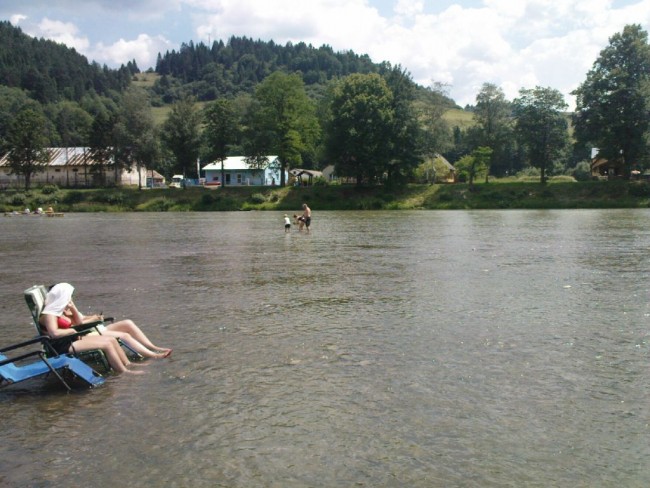 Wakacje z Olą 2014 r.-122.jpeg Woda w Dunajcu jest płytka. Dziewczyny moczą nogi. |