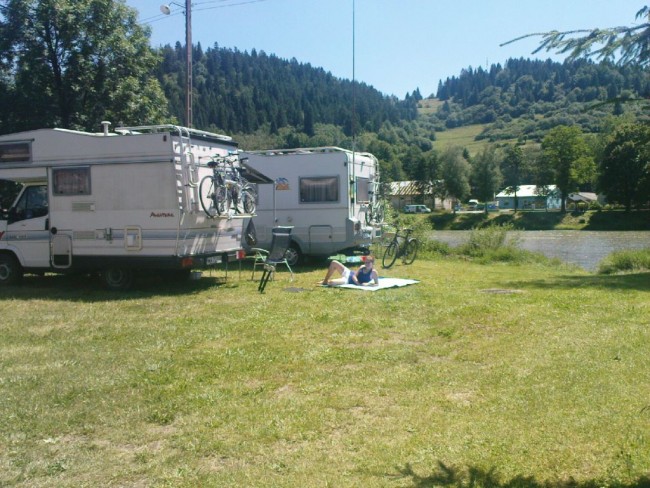 Po kilku godzinach pobytu na tym polu postanowiliśmy jechać dalej, do CISNEJ. A pogoda zachęcała. W cieniu było +25*C, bajka. A w Cisnej, jak to w Cisnej. Najpierw chcieliśmy ustawić kamperka na polu namiotowym TRAMP. Potem, marsz na obiad. Ten obiekt już znałem w wojaży w minionych latach. Jest ładnie położony nad Solinką. Jednak stan porządków w wiatach i sanitariatach na ziemię nie powala. Ale tak, na jedną noc może być.