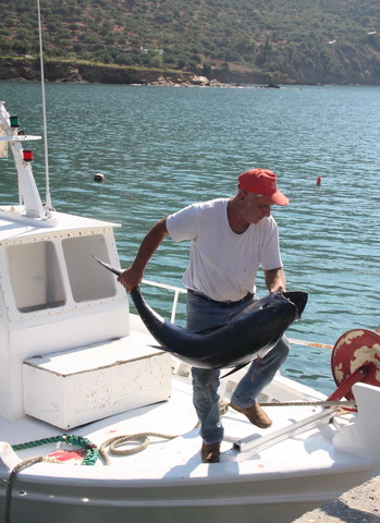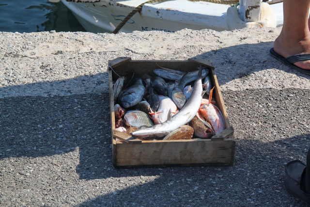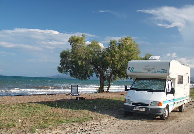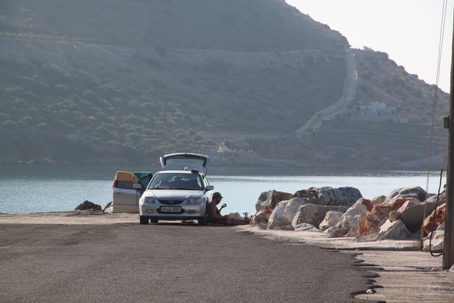 Rano obserwujemy rybaków wracających z morza, połowy bardzo skromne poza jednym oprócz małej skrzyneczki różności wyciąga potężnego tuńczyka. Wbijam w głupka współrzędne z Niemieckich stron i lądujemy 16 km dale na cichej plaży w Kamares (36.681825 22.520832) i stajemy niedaleko Angielskiego kampera. Jak już się ustawiliśmy poleniuchowaliśmy i zgłodnieliśmy zauważamy że zapomnieliśmy o chlebku. Idę na spacer do wioski a tam kilka domów i zamknięta knajpka. Wracam rzut oka na mapę ściągam skuterka i ruszam za chlebem. Pięć km dalej trafiam na "supermarket" tak przynajmniej pisało na wioskowym sklepiku, robię podstawowe zakupy chleb i wino i wracam do leniuchowania. Po południu odwiedzają nas Anglicy trochę pogadaliśmy Oni jutro ruszają dalej a my dalej pełny relaks, jest pięknie. W nocy słyszymy a nawet widzimy gdzieś daleko na północ potężną burzę na szczęście do nas nie dociera i od rana patelnia.