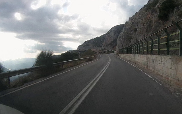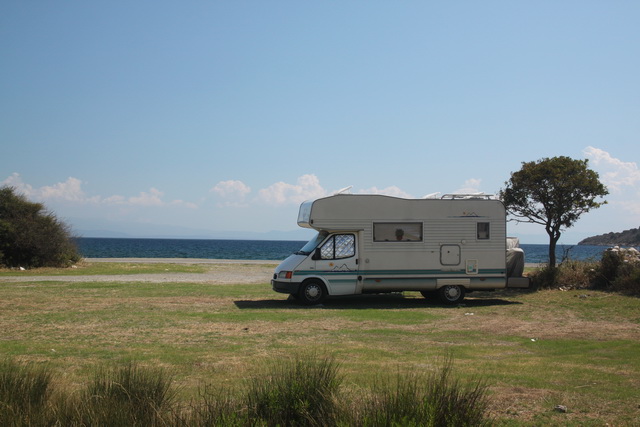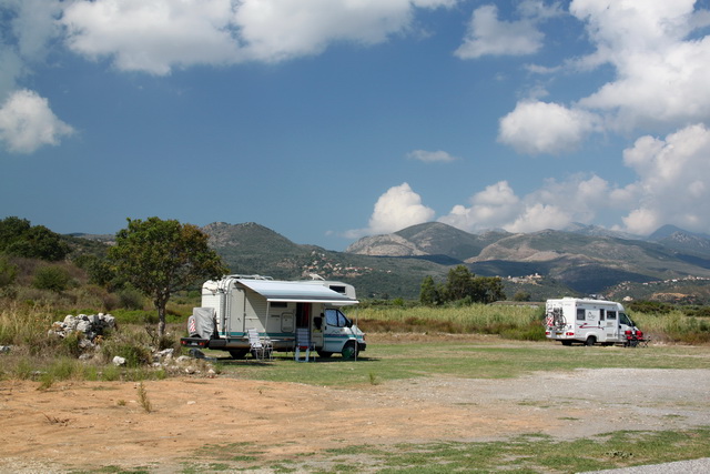 Zmęczeni odpoczynkiem ruszamy dalej. Mamy ambitny plan przez Spartę, Tripoli i Kalawritę do Diakopto. W okolicach Tripoli głupek wprowadził nas w taki skrót że chciałem go potłuc, wreszcie wychodzimy na prostą. Droga nas zaskakuje myślałem że będzie bardzo po górach a tu głównie dolinami tylko jeden stromy podjazd. Przed Kalawritą myję kampera w przydrożnym źródełku z błota po skrócie w okolicach Tripoli. Za Kalawritą stajemy zobaczyć przyklejony do skał Monastyr Mega Spileon a potem piękną widokową trasą do Diakofto. Stajemy na plaży z opisu CamperDiem (38.201952,22.193926) w bardzo międzynarodowym towarzystwie. Jest woda.