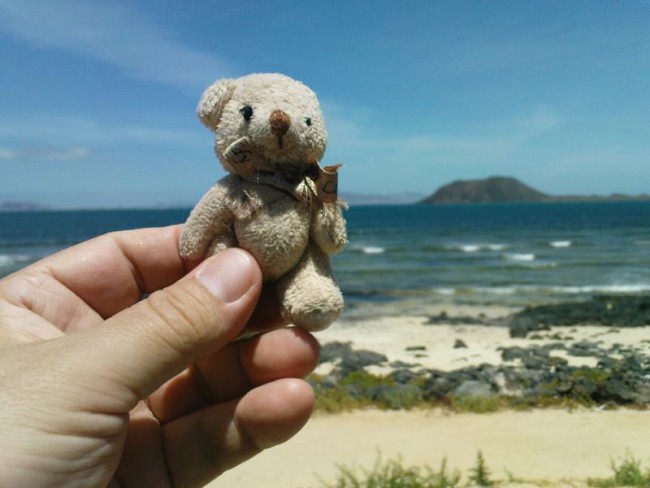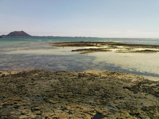Po zdobyciu góry obrałem azymut marszu na ocean. Im bliżej oceanu, tym mniej kamieni, niczym żużel. Doprawdy po takim żużlu idzie się niewygodnie. Ale do wody pozostało mi ok. 2 km. Przy brzegu oceanu jest sporo oczek wodnych. Woda w nich jest bardzo ciepła. Szybko rozebrałem się do kąpielówek i nogi wrzuciłem do wody. To było to. Tylko ja sam: szum fal oceanu, bajeczne horyzonty, lekki cieplutki wiaterek. Jednym słowem sielanka. Gdyby jeszcze słońce nie operowało tak mocno. Ale i tak było wspaniale. Szkoda, że w plecaku miałem zaledwie jedno piwo. Wkrótce okazało sie, że wcale nie jestem sam. Kiedy z plecaka wyjąłem kanapki, wokół mnie pojawiły się nizinne wiewiórki. Na Fuerte jest ich sporo. Śmiało podchodziły do mojego ubrania i do mnie. Ale w plecaku miałem zwykłe herbatniki jeszcze z Polski. Całą paczkę ciastek przeznaczyłem na dożywianie tych na w półoswojonych wiewiórek.