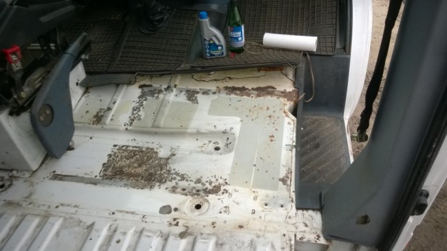 Podłoga i ścianka grodziowa w przedniej części auta zostały odsłonięte. Było zaskakująco mało rdzy jak na 21 lat- głównie powierzchniowej w miejscach styku z podstawami foteli. Potraktowałem ją Cortaninem a następnie Hammerite. Tam gdzie oryginalna mata bitumiczna była luźna, została odłupana, a gdzie mocno trzyma, pozostawiona.