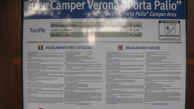 N 45.434448 E 10.977836 - Werona, płatny parking dla kamperów z serwisem, 1 godz. 3€, 4 godz. 5€, 24 godz. 10€
