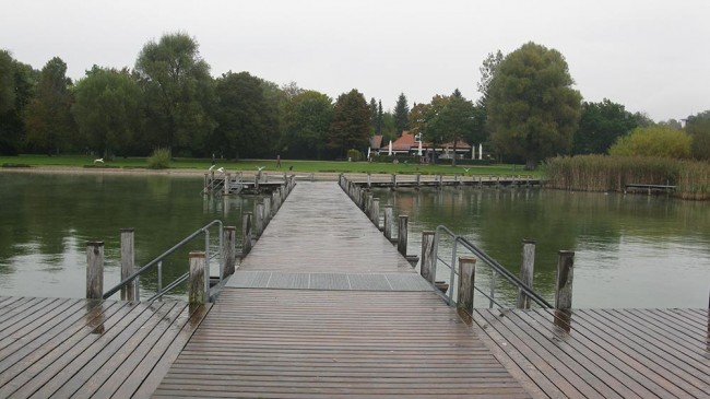 Deszcz pada i pada. Rano w deszczyku idziemy przynajmniej zerknąć na jezioro. Wchodzimy na pomost. Jest szaro buro i zimno. Jezioro spore z czystą wodą, ale Garda to nie jest Wracamy do kampera i ruszamy dalej autostradami w kierunku Drezna. Gładko przejeżdżamy przez Monachium oglądając przez szybę samochodu wieżę, budynek BMW i Allianz Arenę. Jedziemy dalej autostradą A9. Robimy sobie przystanek w Lauf an der Pegnitz na bezpłatnym parkingu dla kamperów z serwisem. Znam to miejsce bo nocowaliśmy tam wracając z Portugalii. Krótki odpoczynek. Wyprowadzenie kota i jedziemy dalej. Z A9 skręcamy w A72 potem w A4, którą docieramy w okolice Drezna do miejscowości Pirna gdzie parkujemy na noc na bezpłatnym parkingu dla kamperów położonym nad rzeką. A deszcz pada i pada.