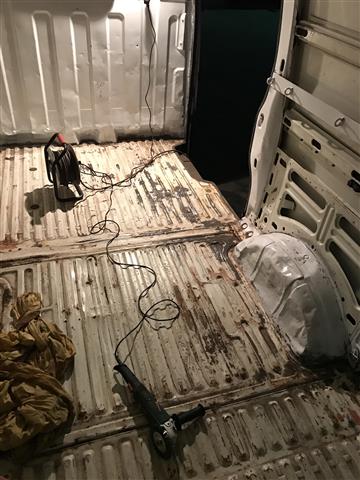 Po zdjęciu zniszczonej i brudnej sklejki i dokopaniu się do podłogi, czas na usunięcie całej rdzy na podłodze i konserwacja podłogi.