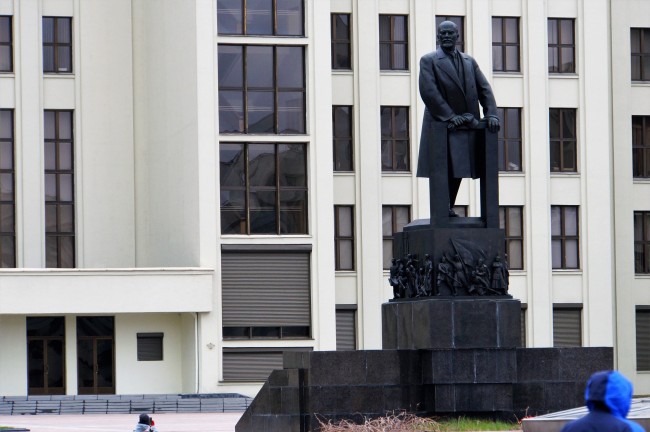 Pomniki Lenina (te wielkie) w większości miast Białorusi i Rosji przedstawiają wodza rewolucji z wyciągniętą wysoko ręką. Miński Lenin jest znany z tego, że jest tu pewnym wyjątkiem. Tu, stoi oparty obiema dłońmi o jakąś barierkę.