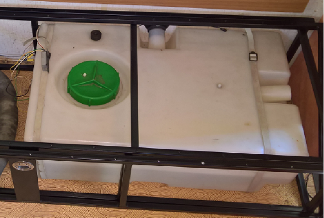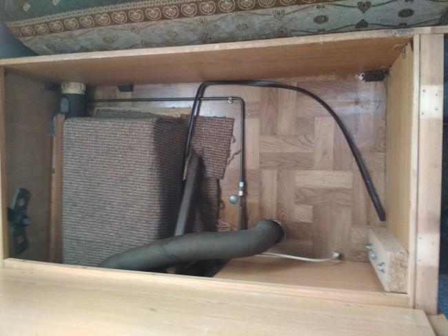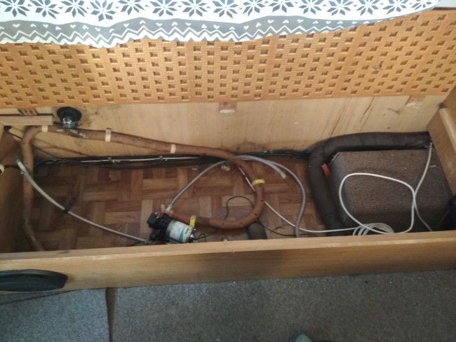 Zrobiłem foty , przestrzeń pod duża kanapa , ta przy ścianie bocznej i krótka , w kierunku jazdy, po krótka niema żadnego zbiornika i chyba nie było. Od czego jest ten kakaowy wężyk ? Od czego może być ten sterownik ? Jest w komorze zbiornika na czystą.