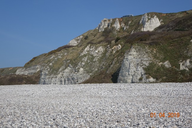 01.04.Jedziemy na wybrzeże bardzo lokalnymi drogami. W Eretrat oglądamy ogród na klifie, z widokiem na miasto i zatokę. Zwiedzamy Yport, Fecamp, ST. Pierre en Port i ST. Jouin Bruneval. Nocujemy przy klifie, na parkingu dla kamperow z serwisem, w ST. Valery en Caux. 6euro.49.8723, 0.70843.