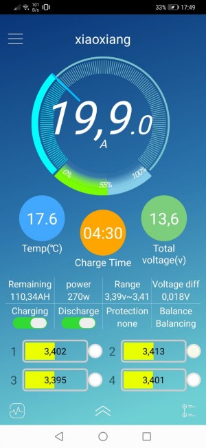 Na energobloku masz ustawiony przełącznik typu aku na kwas, czy żel? Jak na żel, ustaw na kwasa, BMS to sam ogarnie. |