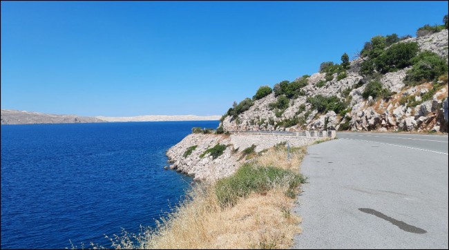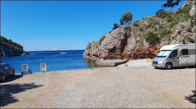 Ja już swój plan, nawet z naddatkiem mam. Teraz tu na miejscu nie ma czasu na ślęczenie nad malutkim ekranem smartfona w poszukiwaniu campingów. Wzrok też wnosi już jakieś ograniczenia. Plan zawsze robię w domu na domowym PC. Teraz fruwam se od campu do campu i sprawdzam na 1 miejscu temperaturę wody w morzu. Robię to jak zwykle palcem. Jak jest zimna to uciekam dalej na południe. Tu na wyspie Pag woda jest już znośna. Do plaży mam ok. 200 m. Tylko cienia brak.