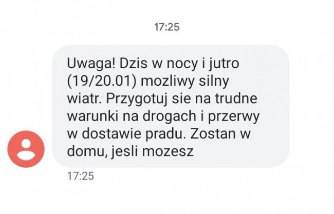 SMS: "Uwaga! Dzis w nocy i jutro (19/20.01) mozliwy silny wiatr. Przygotuj sie na trudne warunki na drogach i przerwy w dostawie pradu. Zostan w domu, jesli mozesz. " |