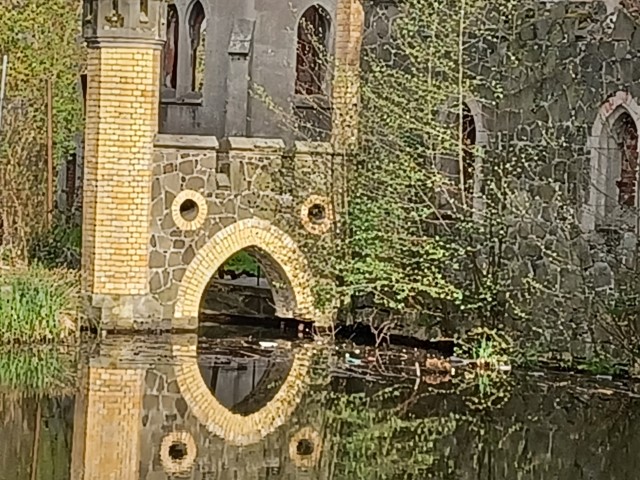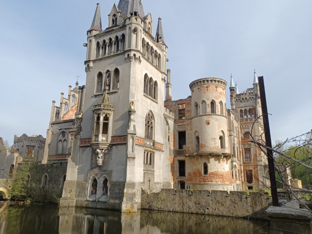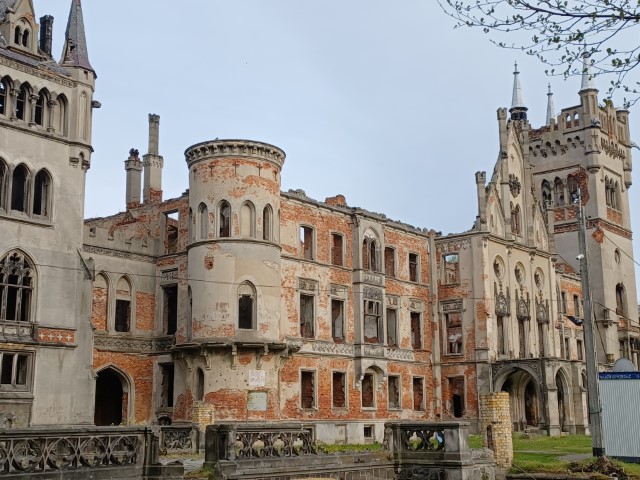 Całość przetrwała wojenna zawieruchę, ale nie przetrwała dziwnych czasów PRL-u. Pałac podpalono, a pożar zniszczył wnętrza, zostawiając imponujące ruiny. Kolejni prywatni właściciele ogradzali teren i udawali, że coś robią, ale to raczej było – jak powiedzieli nam lokalni wędkarze spotkani nad pałacowym stawem – pranie pieniędzy lub jakieś ulgi podatkowe.