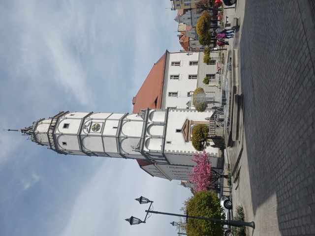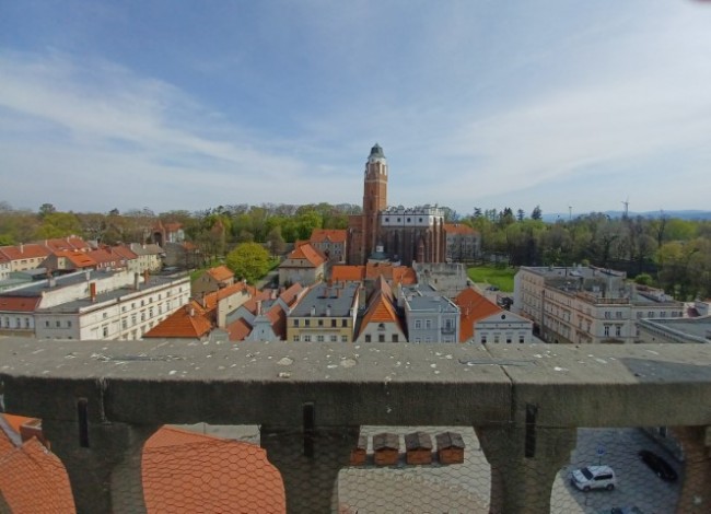 Paczków - jak to miasteczko średniowieczne, ma oczywiście rynek z odchodzącymi od niego prostopadle i symetrycznie uliczkami w liczbie dziesięciu. Na rynku stoi ratusz, którego pierwotny renesansowy styl zachowała tylko wieża. Wdrapaliśmy się na jej kręte, miejscami ograniczone bardzo niskim stropem schody. Było warto, bo po pierwsze na górze zobaczyliśmy trzy dzwony z XVIII wieku, a po drugie – mogliśmy podziwiać panoramę Paczkowa z wyróżniającą się potężną sylwetką warownego kościoła.