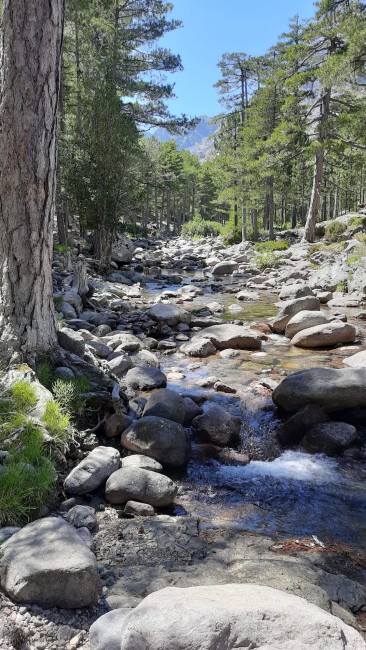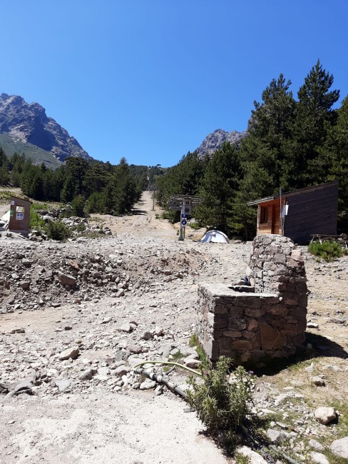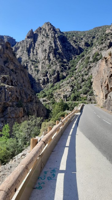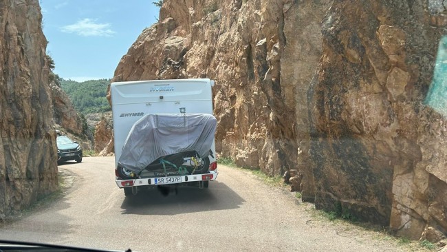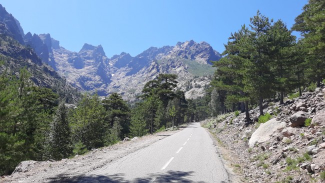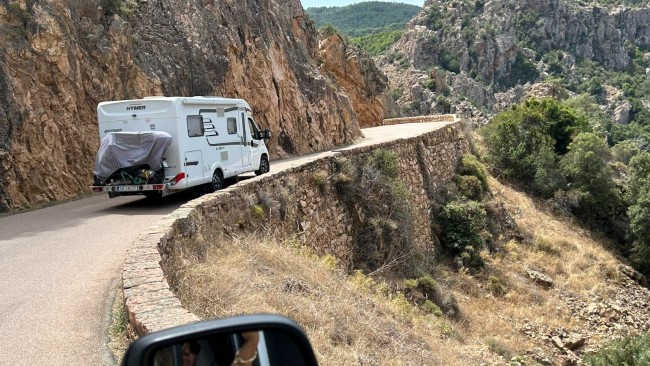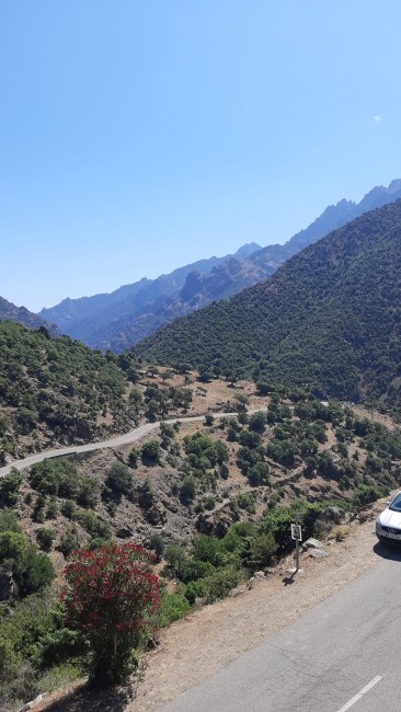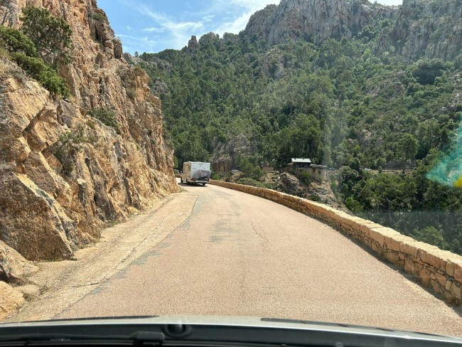W drodze pod Monnte Cinto podjeżdżamy pod kamping Tizarella na d147, to ostatni jadąc w górę, ale ja wypatrzyłem jeszcze jeden na górze 4km przed stacją narciarską, więc czemu nie spróbować jednak to nie był dobry pomysł.Jakieś 2-3km za kampingiem droga stała się wąska a potem naprawdę wąska, do tego brak barierek. Nie będę tu opisywał komentarzy jakie słyszałem z prawego siedzenia. Mnie też pot zaczął trochę lecieć po plecach, ale szczęście się do mnie uśmiechnęło, bo na jednym z wewnętrznych zakrętów było na tyle szeroko że na 5-6 razy z ‘’dupką wystającą „nad tak zwaną przepaścią udało się zawrócić i ostatecznie zacumować na Tizarella. Kamping całkiem fajny z basenem, restauracją, za płotem rzeka. Miejsca postojowe trochę chaotycznie, porozrzucane między drzewami, ale był cień. Cena -31e, dodam, że to najdroższy postój podczas tych wakacji. W sobotę robimy sobie wycieczkę na mopliku w górę, do końca drogi to 25km. Po drodze jest jeszcze miejscowość Asco. Gdyby komuś przyszło do głowy jechać tam pełnowymiarowym kamperem to raczej zdecydowanie odradzam, bo szkoda nerwów i ryzykowania uszkodzenia kampera o wystające skały. Wysokościomierz na kampingu pokazuje mi 300mnpm a przy stacji narciarskiej 1400. Przejeżdżając obok górnego kampingu nie widziałem ani jednego kampera tylko małe busiki, osobówki i namioty, więc decyzja, żeby tam nie jechać była słuszna. Naczelne dowództwo miało rację, ale wyjechać czymś mniejszym jak najbardziej, bo w pogodny dzień widoki są tego warte.