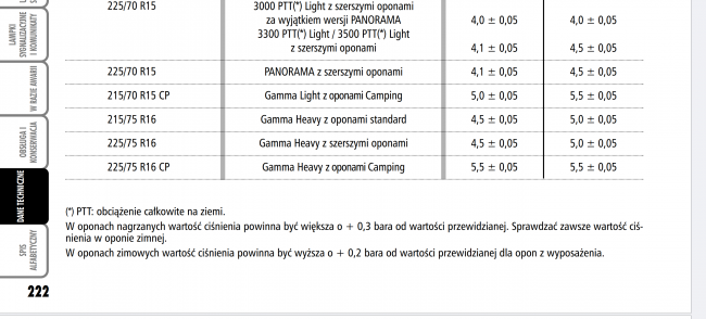 W moim Fordzie jest podane ciśnienie 3,5 na przód i 5,5 na tył, ale w instrukcji jest dopisek, że dotyczy to opon z oznaczeniem CP (Camper) na jakich kamper wychodził z fabryki. Dla innych opon wartości ciśnienia mogą być inne. Ja mam obecnie z oznaczeniem C i mam 4,0 na przedzie i 5,0 na tyle. |