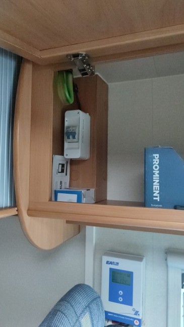 Dziura w dachu poprzez półkę, tam też umieściłem bezpiecznik typu "S" - 40A. Gdy się zamknie szafkę to nic nie widać .