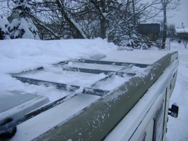 Chodzić właściwie można po każdym dachu kamperka , ale obciążenie śniegu na tą chwilę jest naprawdę duże , mając na kontenerze ciężarówki ok.20 cm. śniegu , profile poprzeczne(aluminiowe) zostały ugięte środkiem o 3cm.
