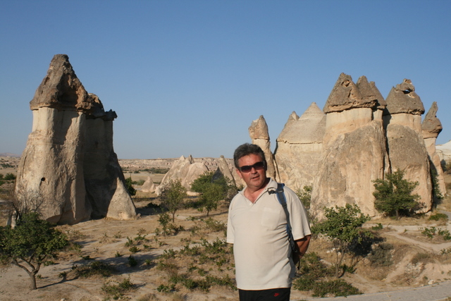 Po śniadaniu jedziemy do KAPADOCJI. Kraina ta swój przepiękny krajobraz zawdzięcza procesowi erozji tufu wulkanicznego /skamieniały popiół/. Z miejsca noclegu zabieramy pasażera na gapę, który jedzie z nami do AKSARAY. Podróż upływa na pogawędce o tym skąd jesteśmy, o tym że wie kto to jest JP II, o polskich piłkarzach grających w tureckich zespołach. Z uwagi, że językiem porozumienia jest język migowy zmęczeni dojeżdżamy do AKSARAY. Dalej udajemy się do stolicy Kapadocji – NEVSEHIR. Celem jest UCHISAR najwyższa góra / skała/ w Kapadocji, z której rozciąga się przepiękny widok na okolicę. Postój u podnóża skały i zwiedzanie wykutych w skale korytarzy i pomieszczeń. Świat bajki jednak dopiero przed nami. Jedziemy do GOREME. Ponieważ Kapadocja to obszar zaledwie około 300 km2 wypożyczamy skuterek i w ten sposób docieramy, czasami po bezdrożach, do wszystkich atrakcji regionu. Tuż przed zachodem słońca powtórnie wracamy pod UCHISAR, by obejrzeć panoramę o zachodzie słońca. Wieczorem szukamy kempingu i po mrożącej krew w żyłach przygodzie docieramy do kempingu PANORAMA na przedmieściach GOREME. Nasza przygoda związana była z tym iż w pewnym momencie kamperek odmówił wjazdu pod stromą górę i zaczął staczać się w dół. Powód był prozaiczny – zbyt dociążony tył, za duże ciśnienie w przednich oponach i śliska nawierzchnia z kostki. Skończyło się na szczęście lekkim wgnieceniem rynienki bagażnika, urwaniem tabliczki ELWOOD i strachem. No cóż, prawdą jest, że podróże kształcą. Na kempingu jesteśmy sami /jest wrzesień/ a bajkowy widok na GOREME pozwala zapomnieć o niedawnych przeżyciach. Kolacja w restauracji kempingowej zamienia się w długą pogawędkę z właścicielem i przy butelkach wspaniałego wina siedząc na tarasie podziwiamy KAPADOCJĘ nocą.