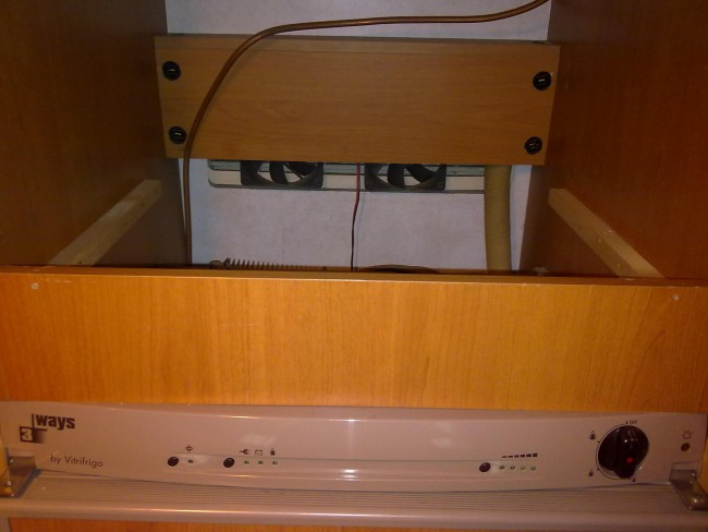 Zabralem sie za rozbebeszanie lodowki, co by popatrzec jak to jest rozwiazane. Podlaczylem pradzik, miernik w rece, a tu niespodzianka, lodowka smiga na 230v jak "ta lala". Miernikiem niewiele wskoralem, po za tym ze na pierwszych kostkach ustalilem napiecie, a przy panelu steryjacym juz nic nie moglem znalezc, wiec aby nie przedobrzyc zostawilem. Odkrylem dodatkowo, ze posiadam juz wentylatory, ale nie moglem/chcialem ich "odpalic na krotko" aby czasm nie spalic ich przez pomylke. Tak to wyglada na fotkach