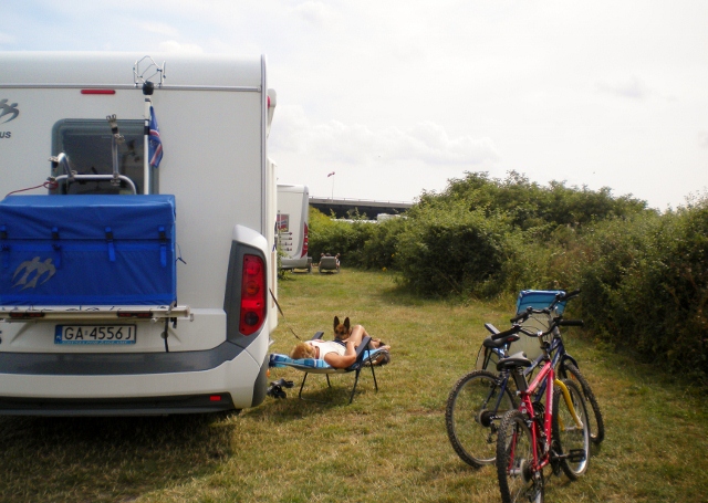 Kierujemy się na wyspę Mon. Jadąc mostem z Zelandii na wyspę Falster w połowie mostu jest zjazd na wyspę Faro, gdzie jest bardzo ładny parking , zagospodarowany , przystosowany do postoju również kamperów, pełny serwis kamperowy. W pewnej części autostrada przykrywa brzeg, tam zadomowili się motocykliści, mając naturalną ochronę przed ewentualnym deszczem. Nocujemy.