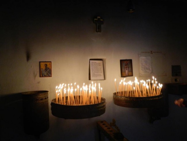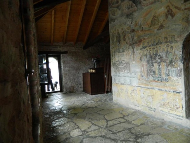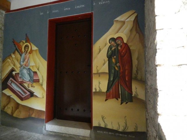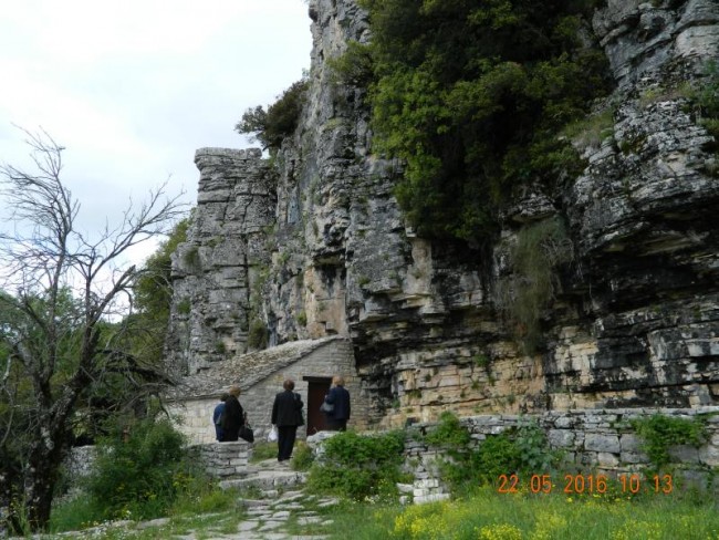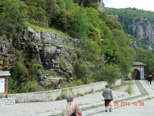 Wracamy do miasteczka,i skrecamy w drugie miejsce gdzie jest parking,ryneczek,oraz kilka monastyrów,jak pisze przewodnik zamknietych,ale w niedziele otwarte.Idziemy za ludźmi do monastyru,na skraju wąwozu .Agia Paraskewi.Madamki odswietnie ubrane,nie maja butów do chodzenia po płytach kamiennych,odpoczywaja po drodze.900metrow od ostatniej knajpki.