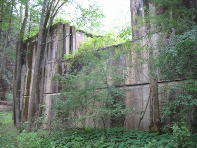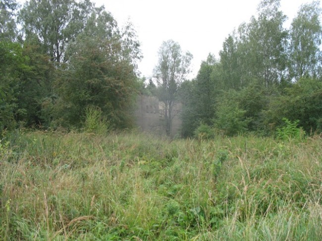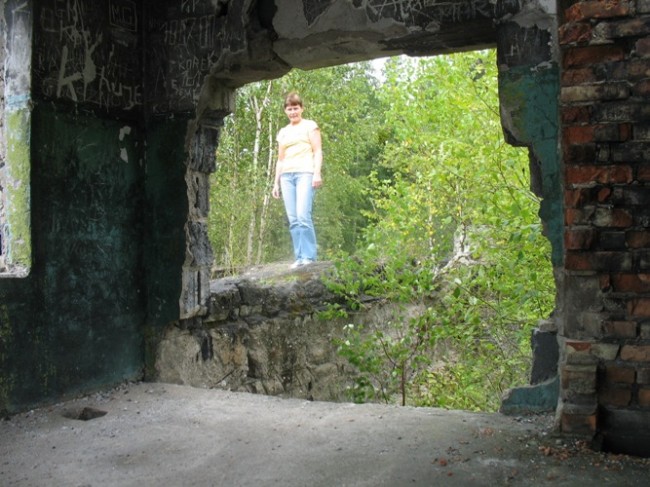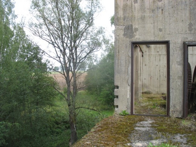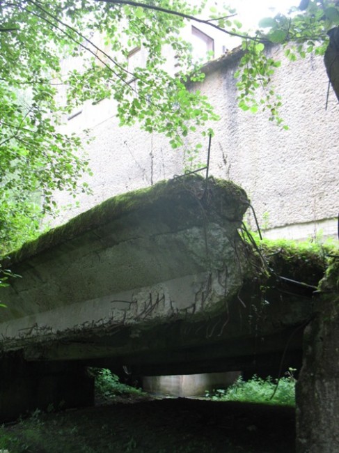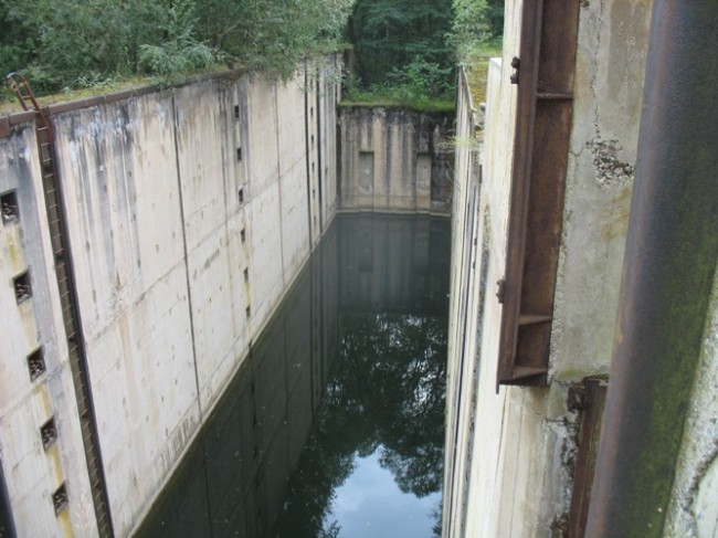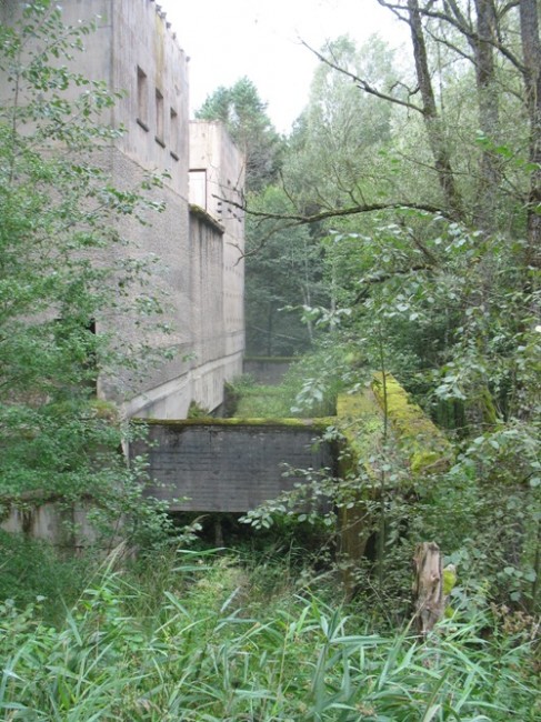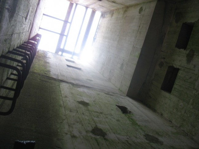 Pod nim przecisnąć się można do środka …Chwila i już stoję przy wejściu do żelbetowego komina po stalowych stopniach w murze.