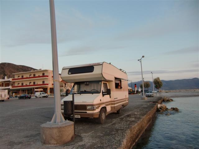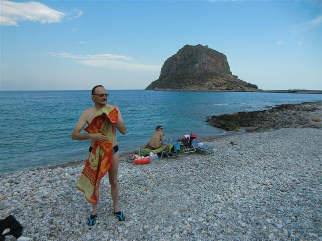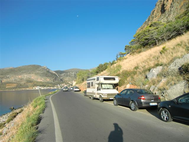 Wczesnym popołudniem wyjechaliśmy z Mistry przez Spartę do Monemwasii, gdzie dotarliśmy po trzeciej. Najpierw pojechaliśmy przez groblę w stronę starego miasta szukając po drodze miejsca na biwak. Ale plaże przy grobli nie były dostępne z drogi, wróciliśmy zatem na wybrzeże do miasteczka i stanęliśmy na ulicy tuż przy plaży. Zasłużyliśmy przecież na odpoczynek i wymarzoną kąpiel.
