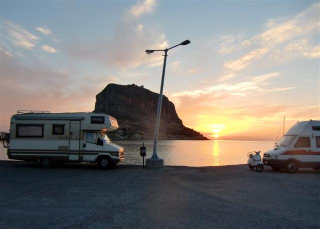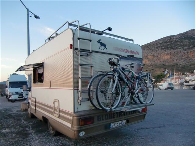 Potem obiad, spacer do portu. Zdzich wyczytał na plaży niepokojącą informację, że biwakowanie jest tu na zabronione i taki „nocleg” kosztuje ponad 100 euro!!! Więc jak zrobiło się mroczno to przestawiliśmy kampera na nadbrzeże portowe, gdzie stanęliśmy w doborowym towarzystwie innych kampero-maniaków. Ponieważ było za wcześnie na spanko więc poszliśmy sobie na piechotkę przez groblę do starego miasta podziwiając po drodze ogrom i stromiznę góry, jaką mieliśmy nadzieję i zamiar pokonać dnia następnego.