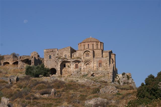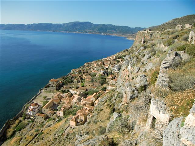 Monemwasia to zaiste urocze zjawisko przyrodniczo – historyczne na Peloponezie. Nazwana została Gibraltarem Wschodu. Na wysokiej na 300m skale połączonej z lądem około 500 metrową groblą znajdują się ruiny miasta wybudowanego w VII w. Dzięki strategicznemu położeniu na skrzyżowaniu morskich szlaków pełniła w dawnych czasach bardzo ważną rolę. Miasto pozostawało blisko 700 lat pod władzą Cesarstwa Bizantyjskiego. W szczytowym okresie rozwoju w tej części miasta znajdowało się ponad 800 domów i 40 kościołów. Miasto zamieszkiwało wtedy 50 tysięcy mieszkańców.