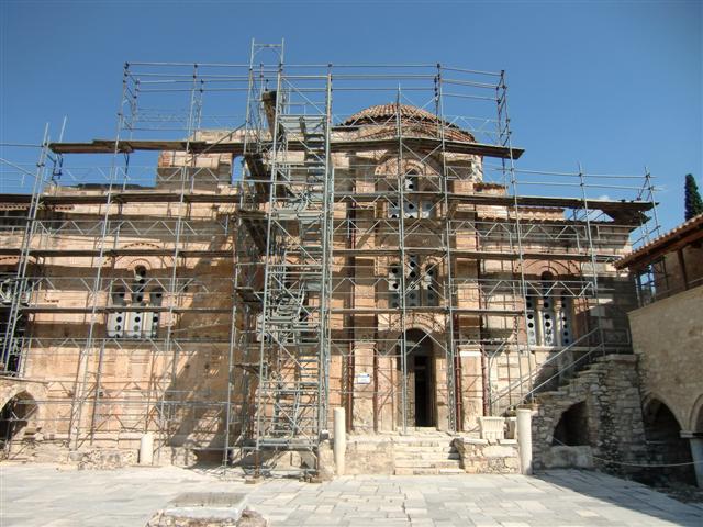 Potem pojechaliśmy zwiedzić klasztor w Dafni. Mieliśmy to szczęście, że zostaliśmy wpuszczeni do środka, mimo, że już od 10-ciu lat jest w remoncie. Mieliśmy okazję z bliska, z rusztowań oglądać słynne mozaiki. Niestety nie wolno było ich fotografować, więc nie mamy dokumentacji.