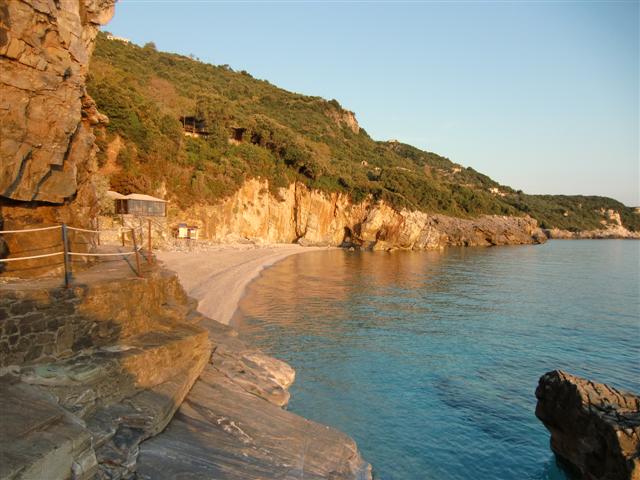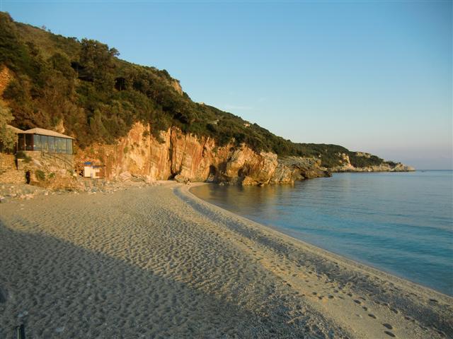 Po drugiej stronie półwyspu Pilion, koło wioski Tsagkarada jest urocza skalista plaża Milopotamos, nad którą chcieliśmy spędzić ostatnią wakacyjną noc w Grecji. Na miejsce dotarliśmy już po zmroku. Powyżej plaży znajduje się parking przy restauracji. Tu zanocowaliśmy.