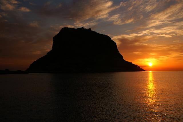 I znów wstaliśmy wcześnie rano aby uniknąć prażącego słońca podczas wspinania się pod górę. Udało nam się uwiecznić na licznych fotografiach wschód słońca wychylającego się ponad morze tuż obok skały Monenwasii. Niektóre z tych fotografii wyszły naprawdę kiczowato!!!