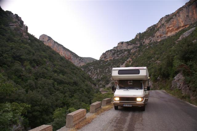 Powoli robiło się ciemno. W głębi wąwozu już było całkiem mroczno. Do Leonidio zajechaliśmy już po zmroku. W mieście szukaliśmy stacji benzynowej bo nasz kamperek wychlał już całą ropę jaką mieliśmy w zapasie z Macedonii i wyraźnie go suszyło.