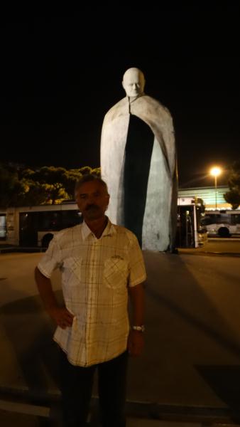 Podjeżdża eleganckie auto, wysiada gość, zdejmuje garnitur, buty i przebiera się w łachy z worka. Nakłada stary filcowy kapelusz, bierze kostur w rękę i na bosaka zasuwa w stronę bazyliki.