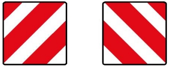 Wszystko, co wystaje ponad 15% długości samochodu (zderzak - zderzak), musi być oznakowane aluminiową tablicą kwadratową o wymiarach 50x50 cm. Mało tego, jeżeli szerokość bagażu jest równa szerokości auta, to muszą być dwie, usytuowane względem siebie jak na obrazku poniżej. Mandat za nieposiadanie takowej: 200 €. Taki przepis i tyle teorii. Co Ty z tym zrobisz to już Twoja sprawa.